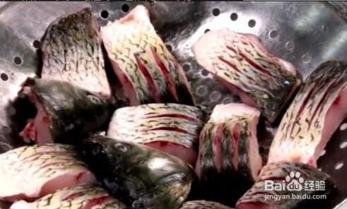 首先把活草鱼砸晕,去鱼鳞,去鱼鳃,清理干净,从鱼的背部去刀,将鱼肚子破开,清理内脏(不要弄破鱼胆),再去除鱼尾,在鱼背上打一字花刀,深到鱼脊骨,第三刀断开,依次类推切开剩余的鱼,切好的鱼块放入碗中,加入盐,用手抓均匀,腌制15分钟,15分钟后,风吹10分钟,10分钟后,翻身,在吹一下(将鱼的表皮吹干,煎的时候不容易粘锅,也比较香)