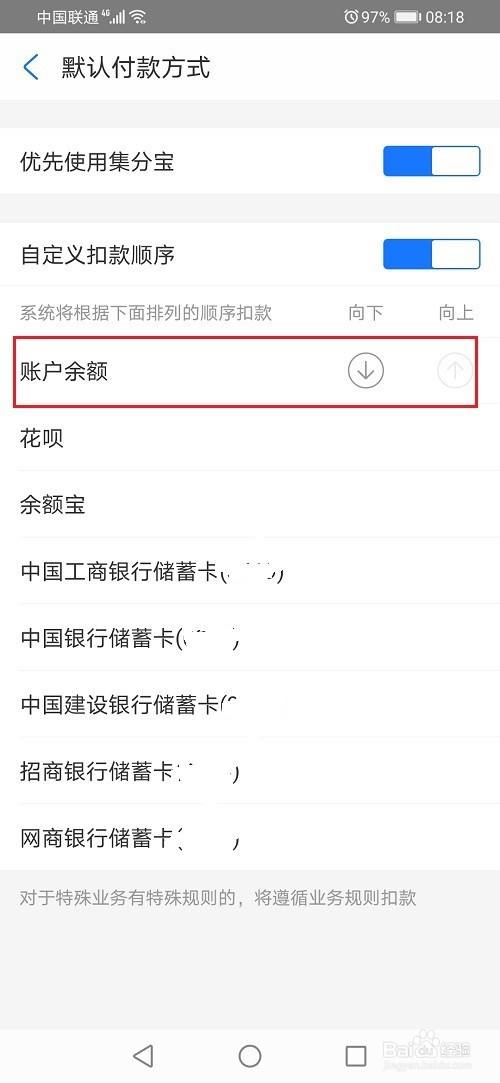 第四步进去默认付款方式之后,选中账户余额,进行上移