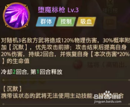 对敌方随机3名武将造成120%物理伤害,并有概率附加【沉默】,攻击结束后提升自身伤害并恢复本次伤害*20%的生命值。