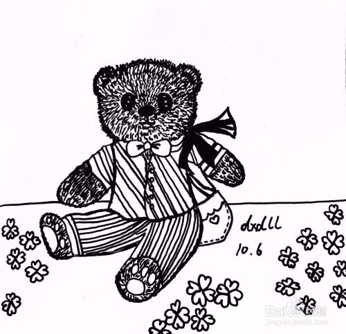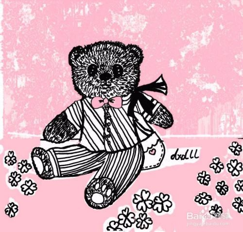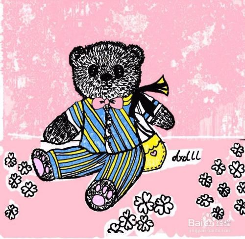 首先用笔画出泰迪熊头部和耳朵轮廓,在小熊脑儿正下方用笔画出眼睛、鼻子和嘴巴。在小熊脖颈处画出蝴蝶结,画出泰迪熊身体、四肢和服装。画出桌布和上面散落的花朵。