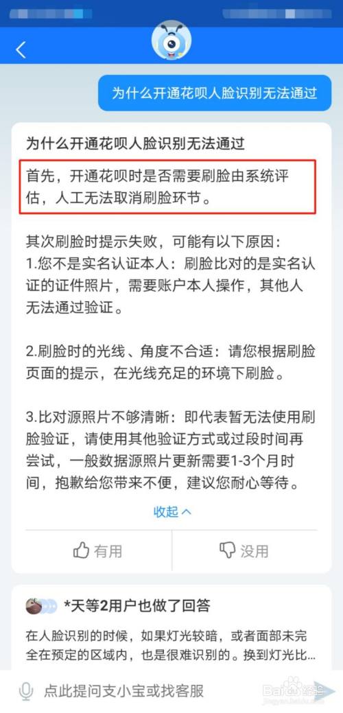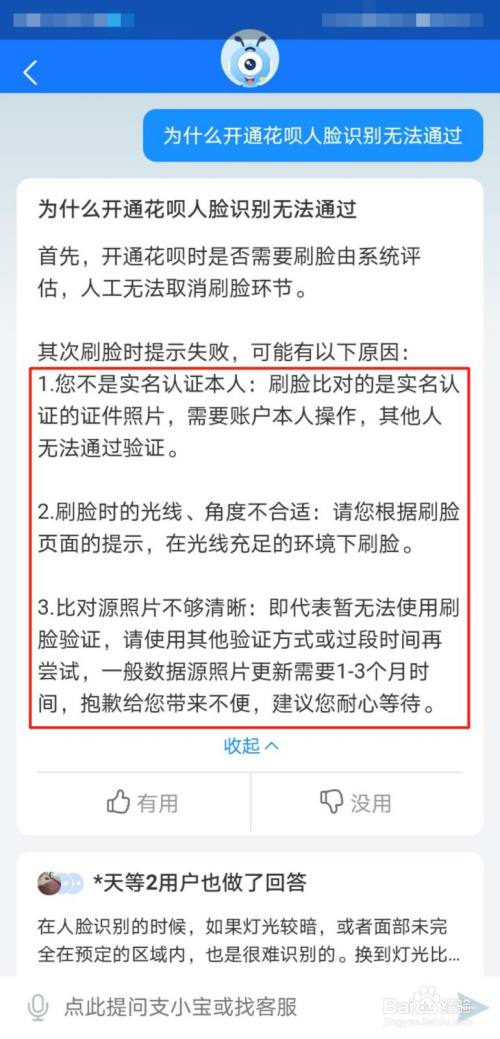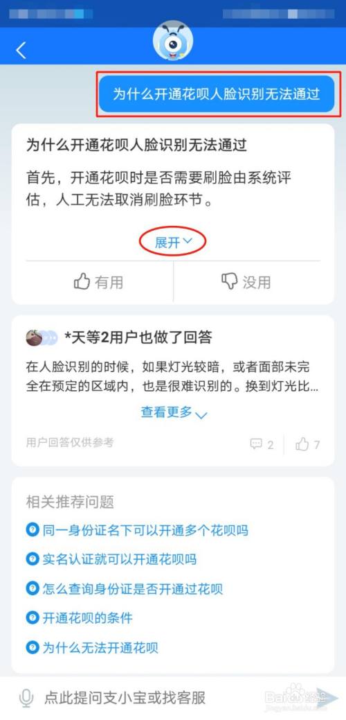 在对话框中输入“为什么开通花呗人脸识别无法通过”,在回复的信息中选择“展开”。