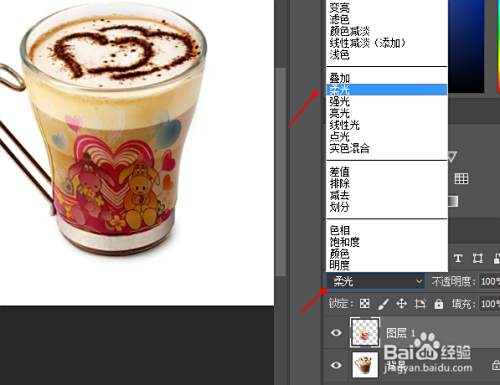 调完了控制点后我们就可以按下回车键确认了,现在来选择图层1打开混合模式为柔光,这样就是为了让图像贴到杯子上。