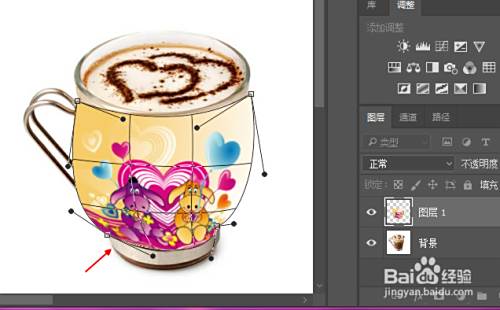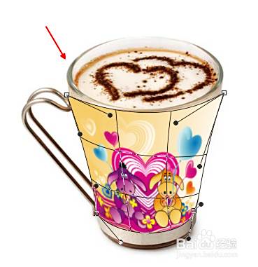 然后我们再拖动左右边两侧的锚点方向点,让图像往里面收缩,图像的底部和上面的控制点都要调整的,我们让图像覆盖住杯子,如图所示。