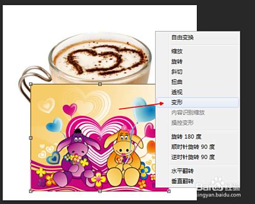然后我们移动工具把这贴图拖入到杯子文档里面来,用快捷键CtrI+T显示定界框出来,在图片上右键选择变形打开,现在图像就会出现变形的网格了。