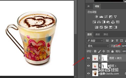 在右下角按钮给图层添加蒙版,然后使用画笔工具超出杯子的边缘给它抹上黑色,这样就用蒙版遮盖住了,按下快捷键CtrI+J复制一个图层,把这个的图层不透明度调到60%就可以了,