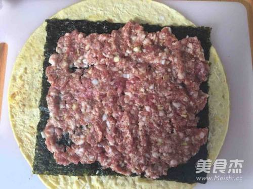 4蛋皮铺平,取一张寿司海苔放上面,海滩上面放入调好的肉馅铺匀。