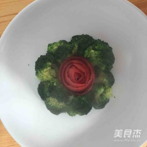 7西红柿削成不断皮卷成花朵,西兰花热水焯熟。如图摆拍。