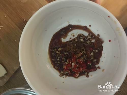 将切好的大蒜和辣椒放入放入碗内,然后再上碗内倒入一些辅料,如,香油,香醋,酱油等,