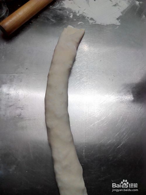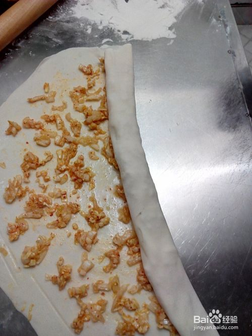把已经醒好的面团拿到面板上,用擀面杖擀薄,将调好的菜倒在上面,铺开,再将其卷起来,见下图。