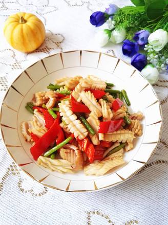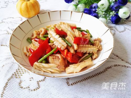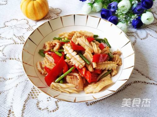 3将鱿鱼切花刀,红椒切菱形,蒜苔切寸段