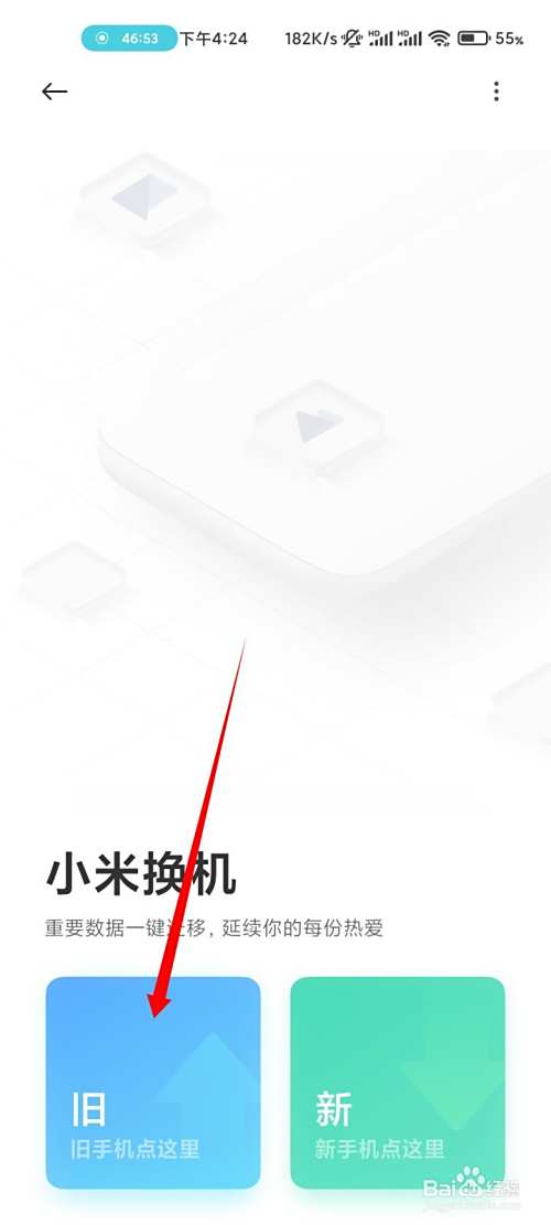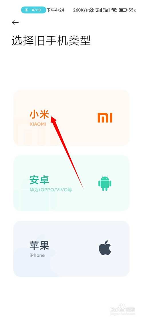 来到选择旧手机类型页面,点击小米的选项,扫描旧手机屏幕上的二维码,选择文件即可开始传输。