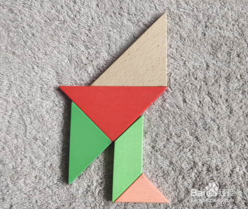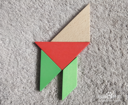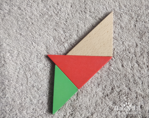 将绿色三角形斜边竖直居于左侧,放在红色三角形的左下挨着,位置如图。