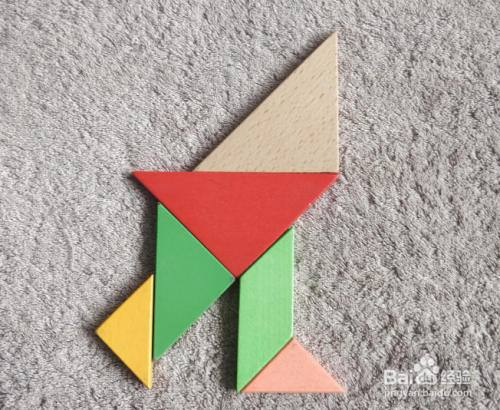 将黄色三角形斜边竖直居于右侧,放在绿色三角形的左下挨着,位置如图。