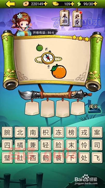 开卷有益:86-6,上面是一个枳子,下面是一个橘子,中间是个指北针,从上北下南,可以推出成语是 南橘北枳。
