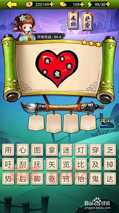 开卷有益:86-4,一颗心里,五个黑色的圈圈,圈圈中写了鬼字,这是 心怀鬼胎,或鬼迷心窍。