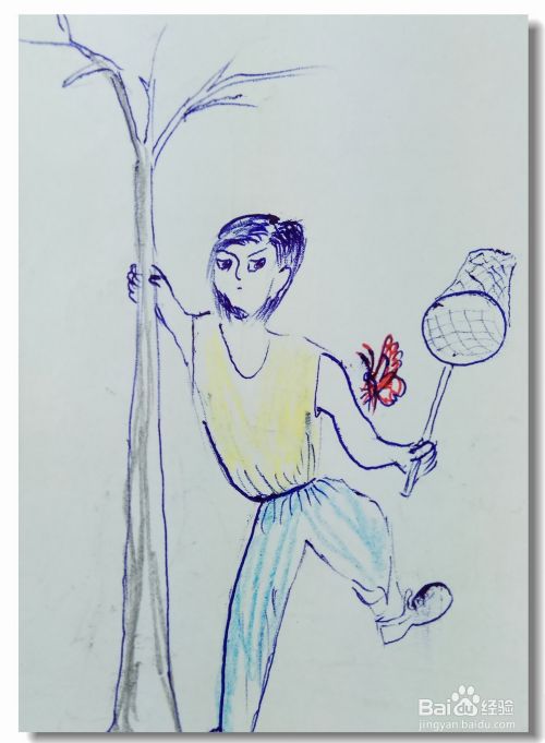 再用蓝色和红色的蜡笔涂出小男孩裤子的颜色和蝴蝶的颜色,简笔画就画好了。