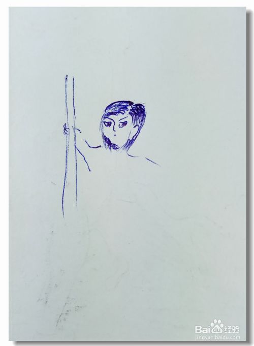 在白纸上画出小男孩的头部轮廓,并画出他的眼睛,鼻子和嘴巴,然后再用粗线条画出他的头发部分,画出小男孩的胳膊和一棵树。