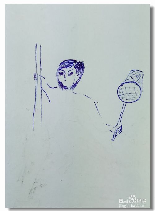 画出小男孩的另外一个胳膊,并画出他手里拿着的一个扑蝴蝶的网兜。