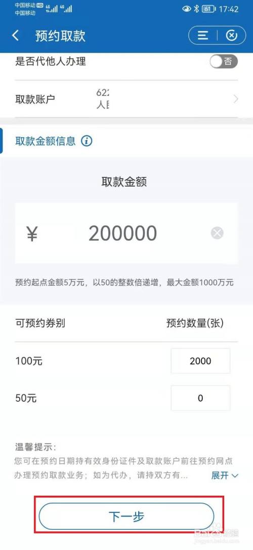进入预约取款申请页面,选择服务网点、取款账户、取款金额后,点击【下一步】。