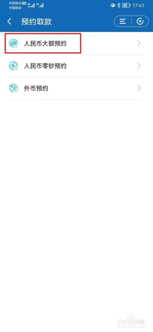 进入预约取款操作页面,选择【人民币大额预约】选项。