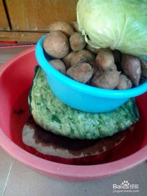 ④把搅拌好的包菜装进那种漏水网袋子里,放在盆里,下面放一个可以垫的,包菜放上去,然后上面放重物。压出水,大约压24个小时(因为是晚上做的所以第二天早上10的时候可以做)