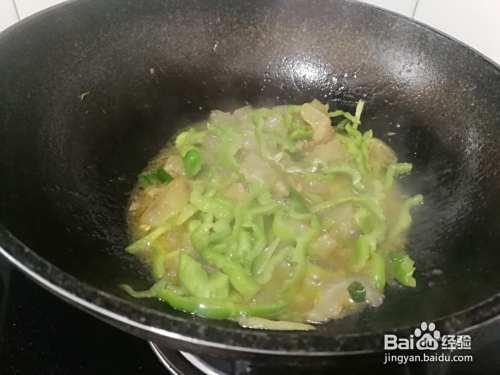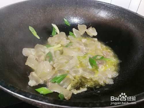 放入葱,姜煸炒,放入牛蹄筋煸炒,放入麻椒煸炒,放入盐,生抽煸炒。
