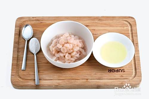 将冲水后的虾仁控干水分、加2g盐、1只蛋清和干淀粉搅匀,放入冰箱冷藏10分钟。
