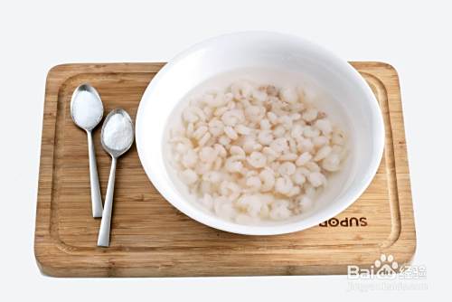 沥干虾仁放入碗中,加入盐5g、5g食用碱,浸泡15分钟后冲水。