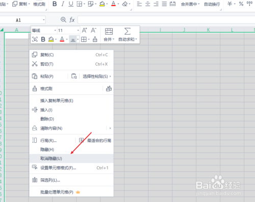 鼠标右键,单击选中的单元格,打开菜单,选择取消隐藏选项。