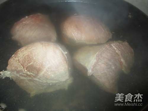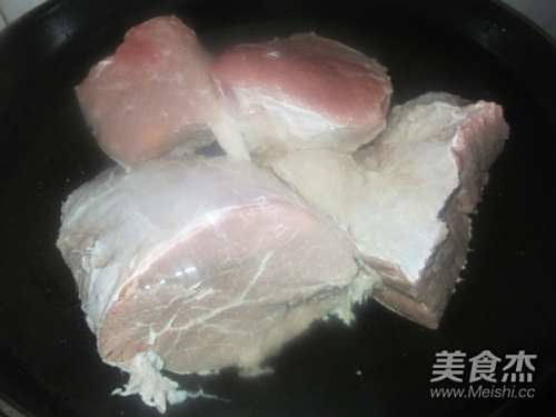2把牛肉切成大块放进锅里,注入冷水,