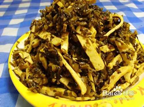 雪菜炒香干。雪里蕻用水冲洗一下,切成丁,香干切成条。锅内倒入少许油,烧热后先将雪菜炒热,然后加入香干。炒熟之后,尝一下咸淡,依据个人口味再酌量加点盐,出锅前放入味精调味即可。