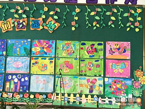 园地的布置。上面用柳叶小花点缀了一下,里面张贴上学生的作品。