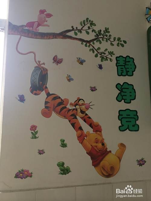 窗户边上的一块空墙,利用起来,帖上卡通动物造型,给教室增添活泼可爱的温馨气氛,边上打印上静、净、竞三字贴上给学生以每天的提醒作用。