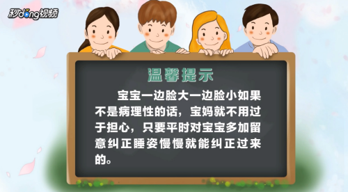 4平时注意观察宝宝,如果一边脸大一边脸小的情况有所改善,记得让宝宝从此两侧多倒换着躺或者平躺,不要再只偏一侧躺。