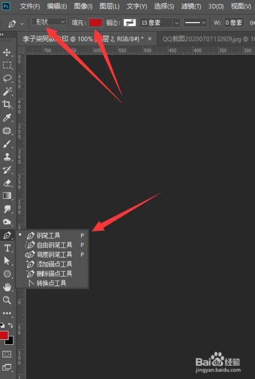 选择钢笔工具,设置颜色为前景色,绘制样式为形状,在画布上画出如图所示的形状。