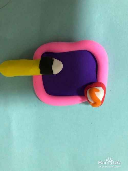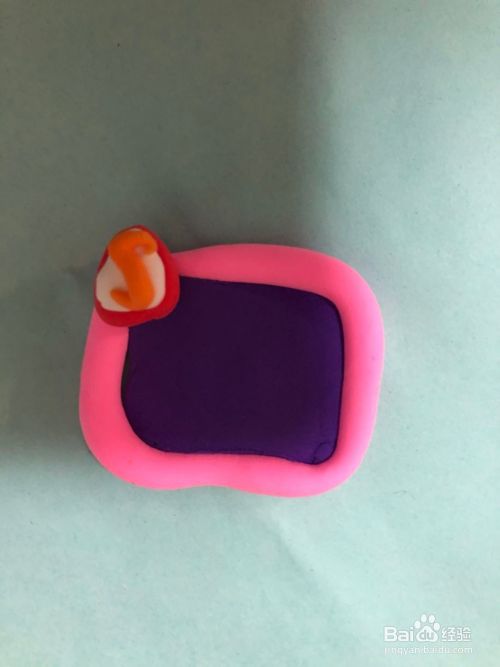揉成一个小长条,围着正方形绕一圈,在拿出红色的彩泥揉成心形,在拿出白色的彩泥揉成心形一连接。