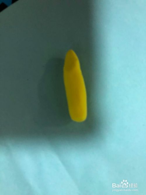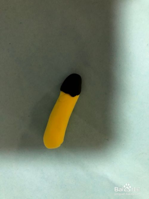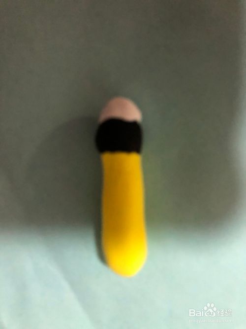 在拿出黄色的彩泥揉成长条,在拿出黑色的彩泥揉成圆形按扁粘到笔尖上面。在拿出白色的彩泥揉成圆形按扁,粘到黑色上面。