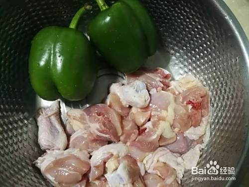 准备2个鸡腿,2个青椒。鸡腿忘了拍,直接剁成鸡块了,嘿嘿。