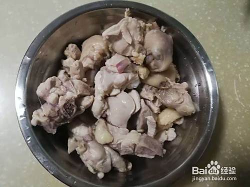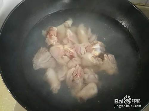 把鸡块开水煮5分钟,去去血水,捞出用温水冲洗干净,备用。