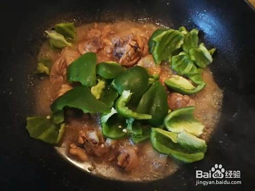 大火烧开,中火慢炖,汤汁收的差不多的时候,加青椒和盐。