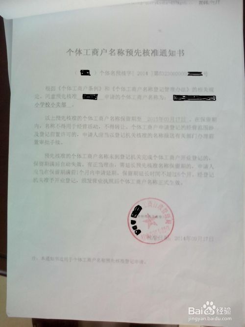 工商工作人员受理后会给你一张加盖红色许可章的《个体工商户名称预先核准通知书》如图。你带上经营者的健康证原件和复印件、身份证复印件、之前签订的《房屋租赁合同》、房东的房产证(或者是土地使用证)复印件和一张经营者的一寸照片到食品药品监督管理局申办《餐饮服务许可证》。