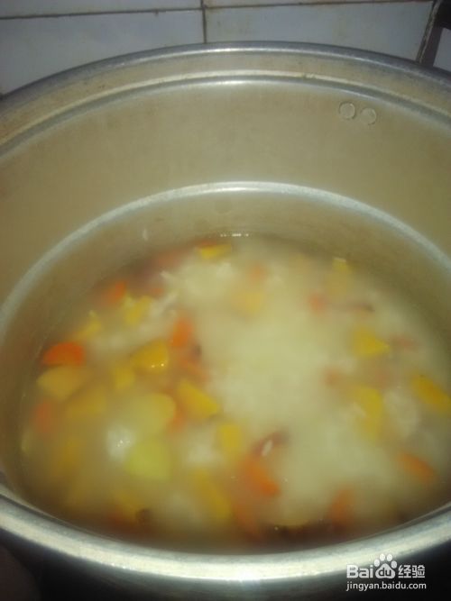 我在剩大米饭里,加入了胡萝卜,土豆和地瓜。让这碗粥更增加了色彩与营养!