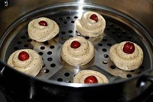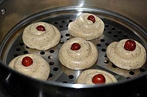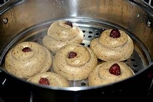 一圈一圈地卷起,尾端较细的部分压在枣泥卷下,依次做好后,放入刷了薄油的蒸锅里醒30分钟