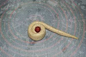 将面团搓成长条,微微用手掌压扁,尾端搓细,用头端将红枣卷起