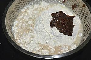 将面粉中加入水,酵母,枣泥,揉匀成光滑的面团,盖上保鲜膜放温暖处发酵,发酵成分2倍大
