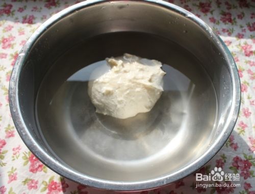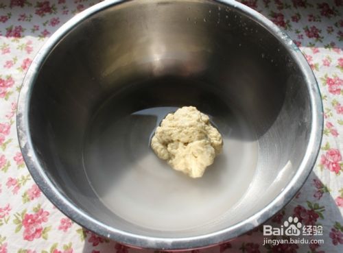 把面团放入水里,像洗衣服一样,不停的洗面团,把洗面团的水全部倒入大容器里,直到洗出清水为止。很简单的一个步骤,面团不会像你想象中那样变成面糊,不会的,它会一直是面团的。洗到最后,面团变小,变成面筋一样,最后面团洗不出颜色了,把面筋团留着做其他菜。水全部留着沉淀。