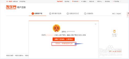 ② 如果该号码曾经注册过淘宝号,点击标蓝部分【不是我的,使用邮箱进行注册】,进行下一步。