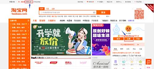 在电脑端打开淘宝网,在所示首页找到标蓝色箭头的地方,二者选一,点击注册。