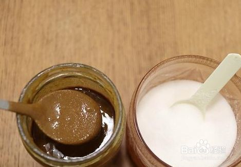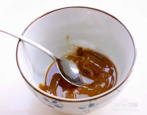 在蒸茄子的过程中,我们来调芝麻酱。取1汤匙芝麻酱,分次添加适量凉白开,用凉白开水把芝麻酱给澥开。