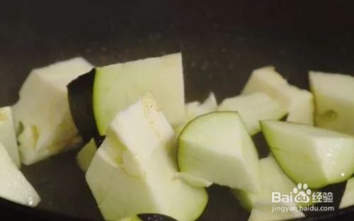 把圆茄洗净去皮,切成大厚片。虽然扔掉茄皮是个很浪费的吃法,但是如果用通常方法来做它,就得去掉茄皮。